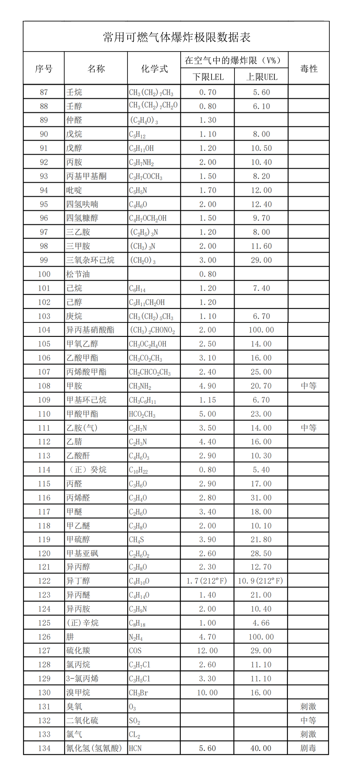 常用可燃气体爆炸极限数据表(三)